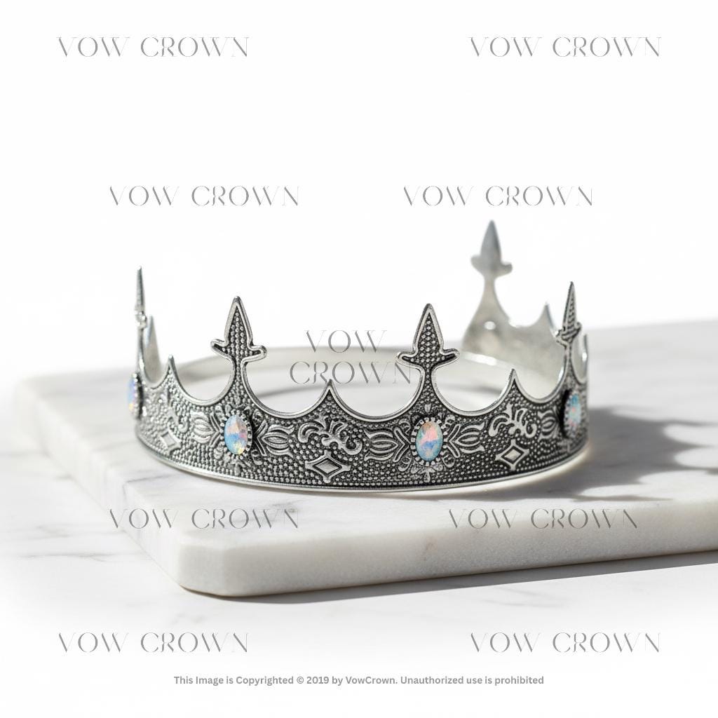 Antique Silver King Crown | Medieval Men’s Blue / Red / Opal Gemstone Royal Crown | Renaissance Cosplay Viking King Tiara