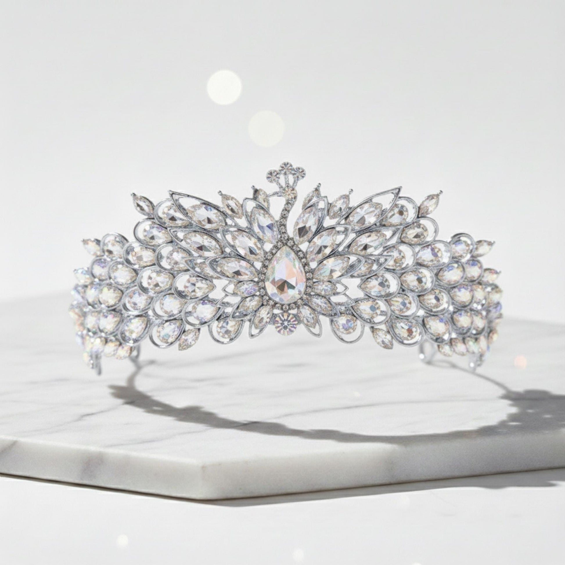 Step into your royal moment with our VowCrown Aurora Peacock Tiara, exquisitely designed for brides, pageants, proms, and glamorous events. Each crown is a masterpiece, handcrafted with Premium Iridescent Aurora Borealis Crystals and dazzling Clear Rhinestones set in an intricate Feathered Peacock Motif that captures the light from every angle β making you shine like true royalty.