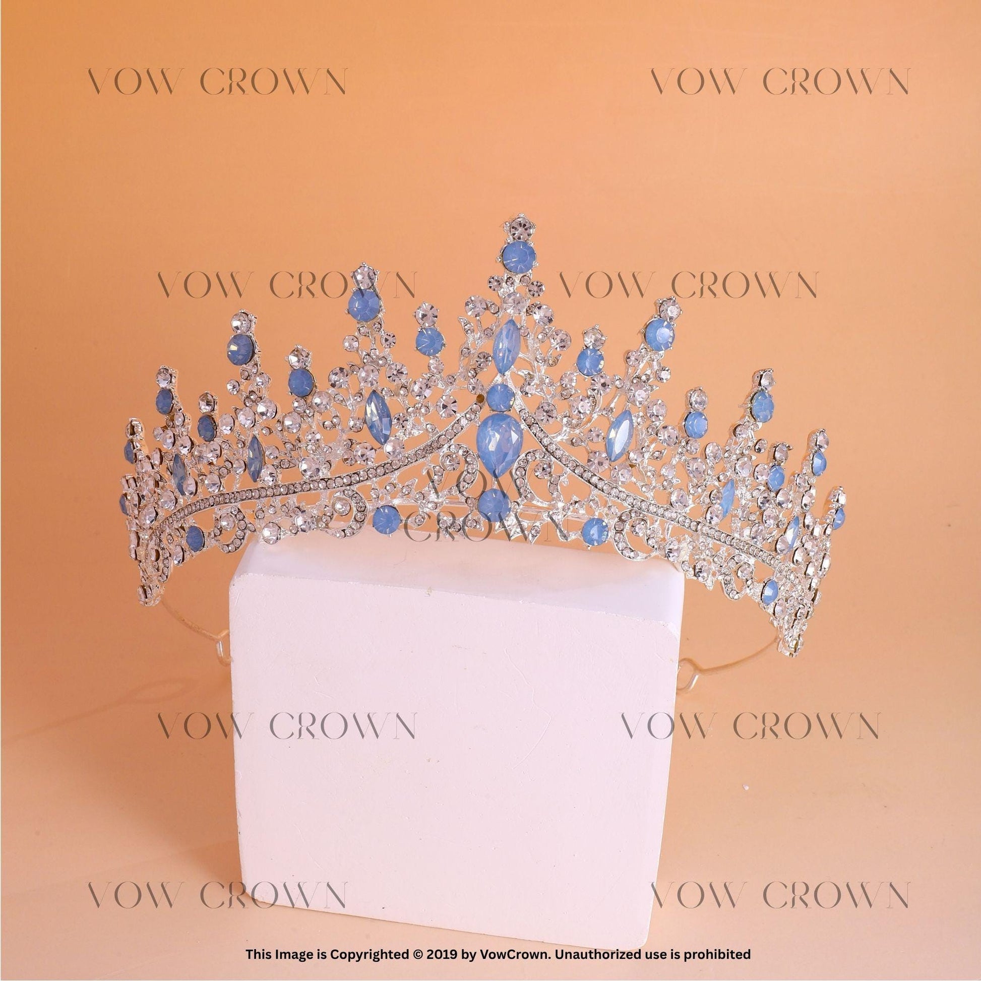 Blue Crystal Silver Crown and Jewelry Set, designed for brides, pageants, or royal-themed events. The elegant tiara features shimmering sky-blue and aquamarine crystals set in a radiant gold base, perfectly paired with a coordinated necklace and earrings to complete your regal look.