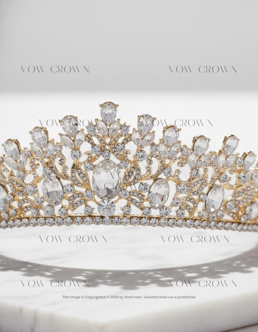Decorated with premium clear crystals arranged in a refined crown silhouette, featuring pear-shaped stones, floral clusters, and ornate gold filigree for a truly royal finish.