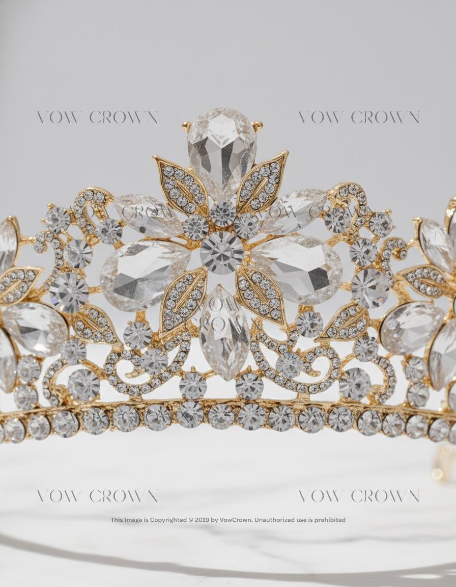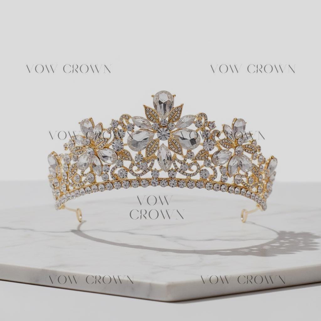 Features premium clear crystals arranged in blooming floral patterns with pear and marquise cuts, accented by intricate gold filigree for a soft yet royal finish.