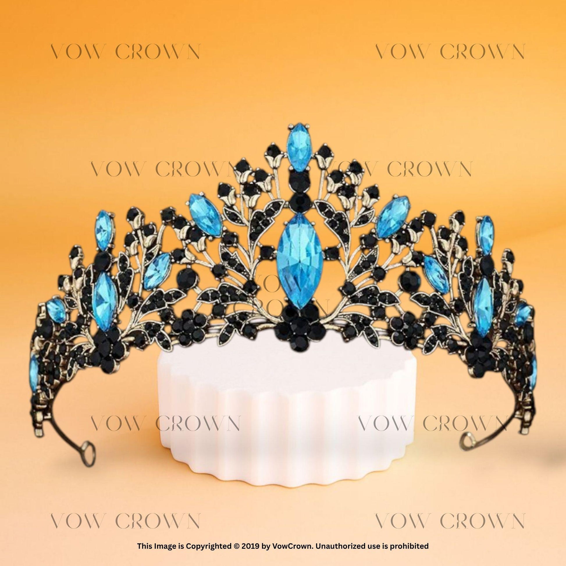 Step into regal elegance with our Blue Gothic Princess Tiara. This vintage-inspired crown is adorned with deep blue marquise-cut crystals and shimmering black leaf motifs, capturing the essence of both mystery and royalty. Perfect for gothic brides, pageants, Halloween queens, or fantasy cosplays.