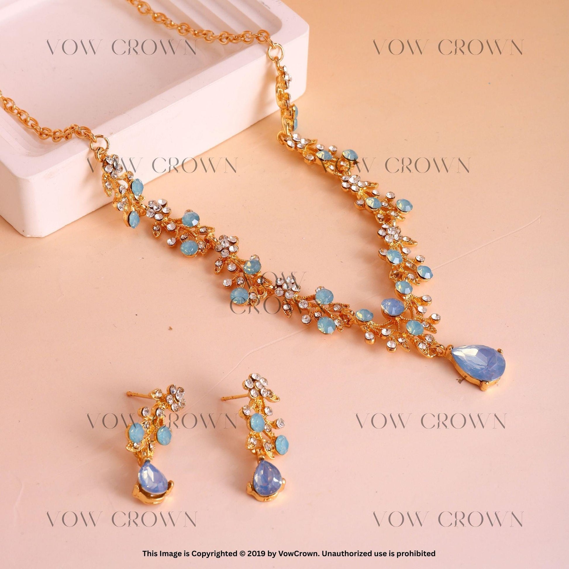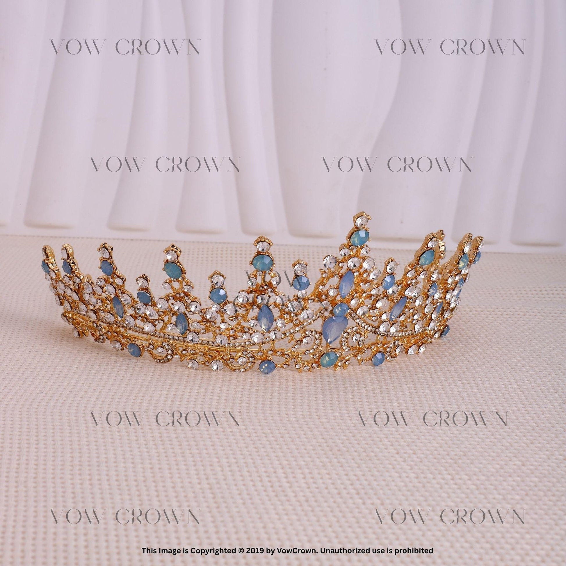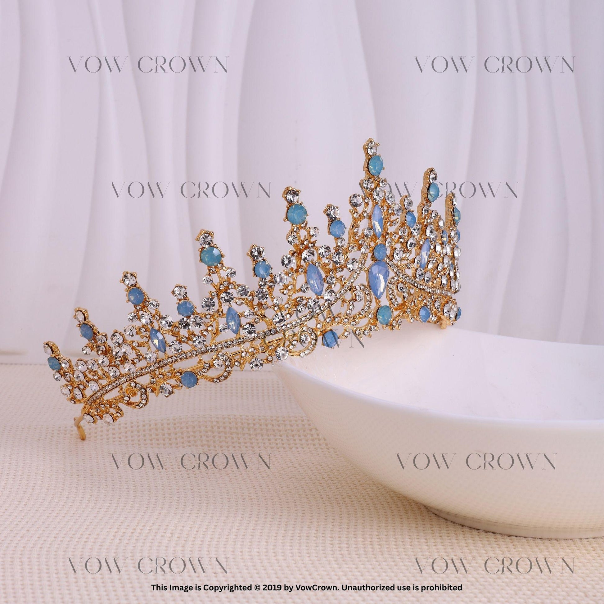 Opal Blue Crystal Tiara Jewelry Set: Bridal Gold Rhinestone Crown